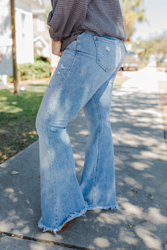 Medium Wash High Rise Inseam Slit Flare Denim Jeans
