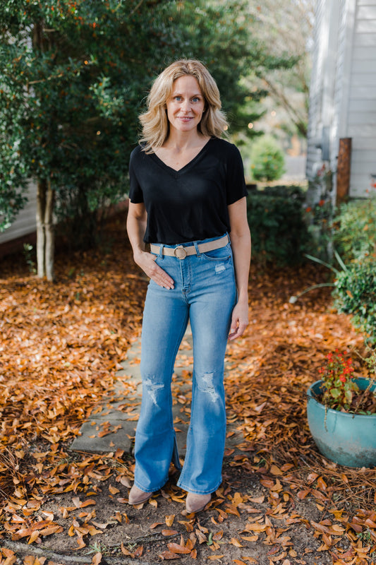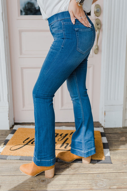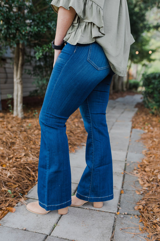 Lightweight High Rise Dark Wash Cello Flare Denim Jeans
