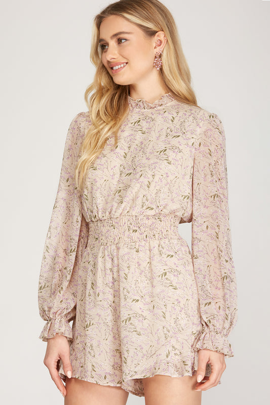 Taupe Scarlet Long Sleeve Smocked Waist Woven Printed Romper