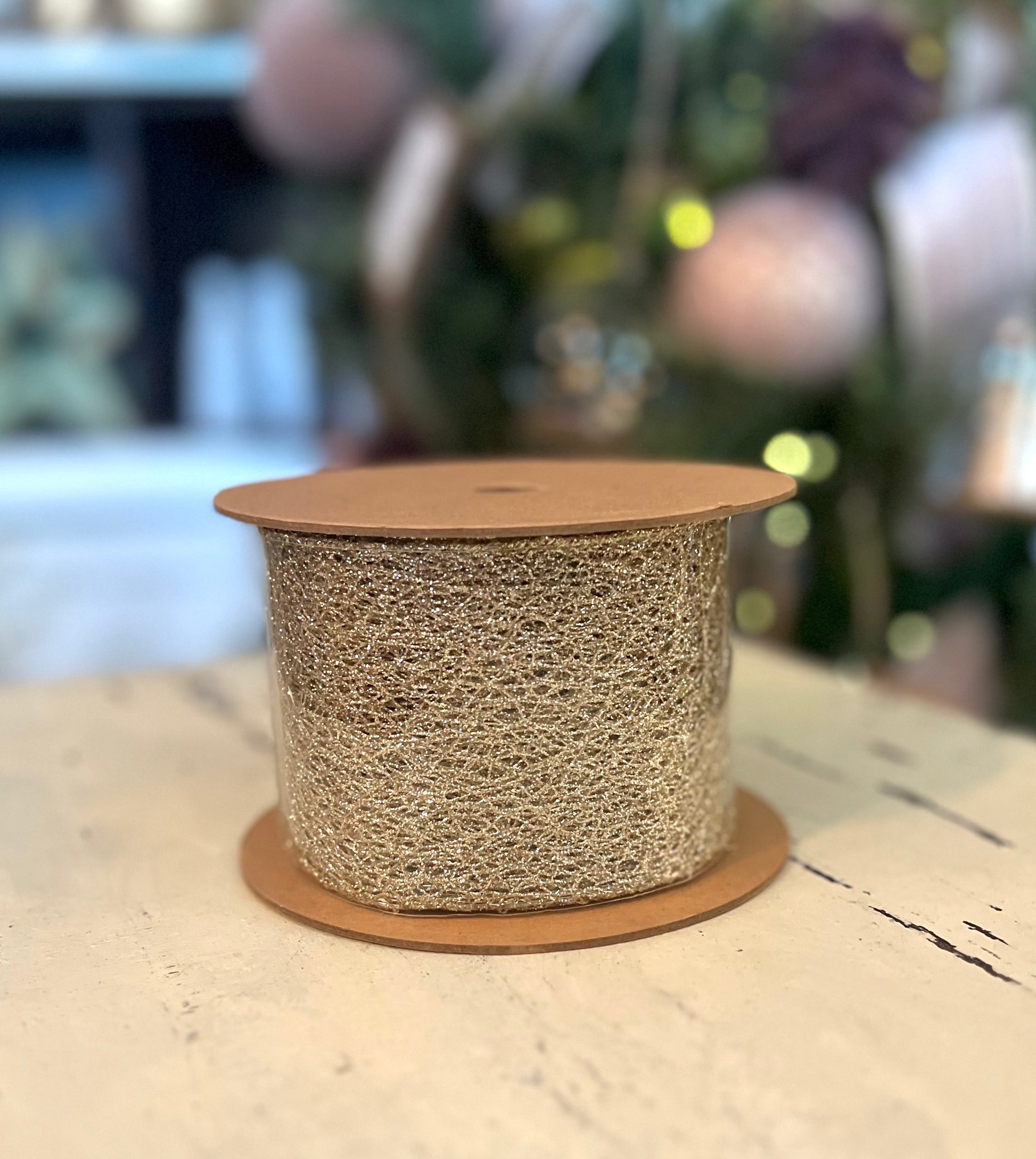 3" Mesh White Gold Wired Ribbon 10 Yard Roll