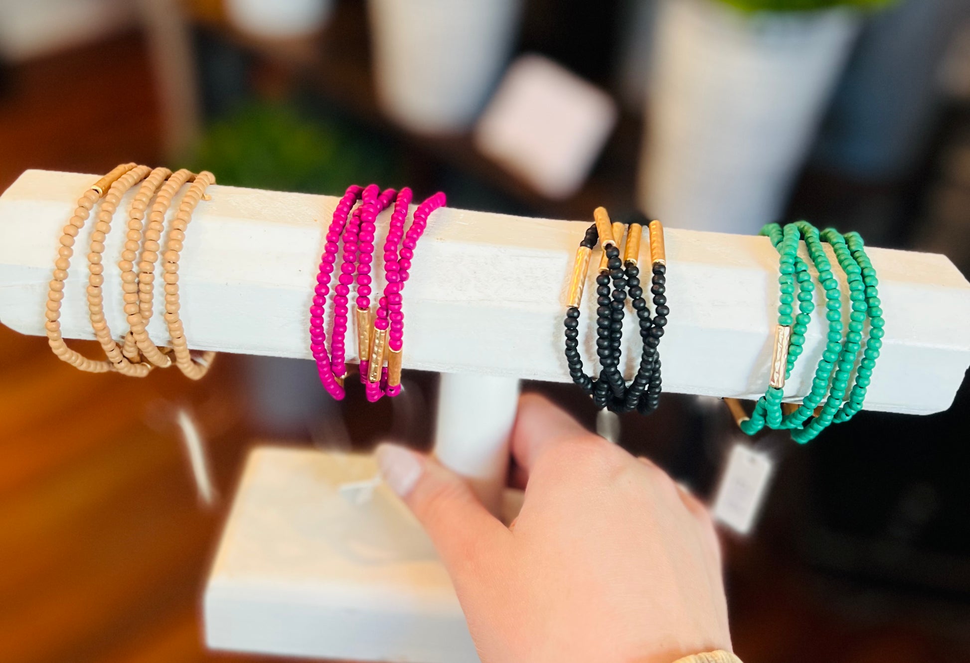 Each one is made of small round beads strung together on an elastic cord, making them stretchy and easy to slip on.