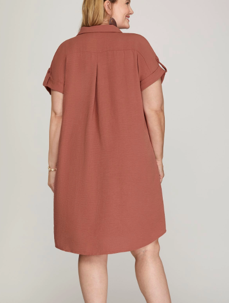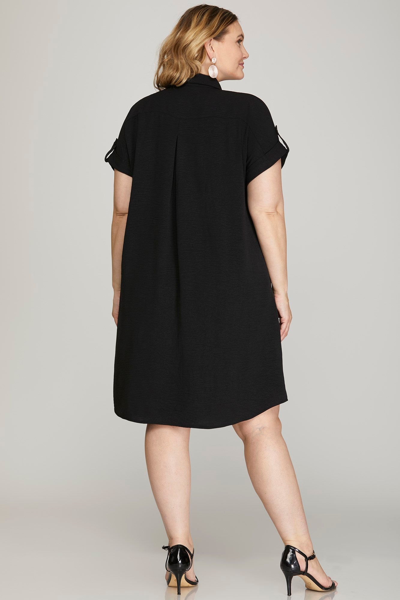 This woven dress features a stylish drop shoulder and button-up design. The model, standing 5'8.5", is shown wearing a size XL, highlighting its flattering fit for curvy figures.