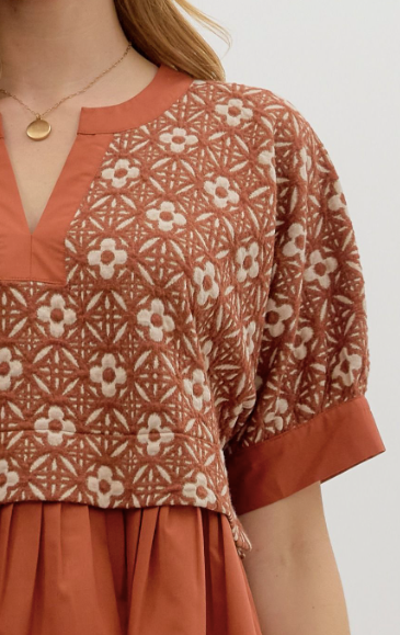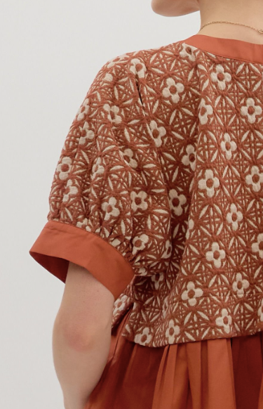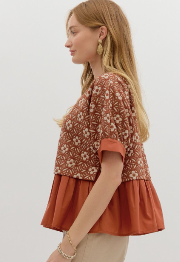 The September Dreaming Top is a floral jacquard pullover with short sleeves, highlighted by a contrasting ruffle hem and band.