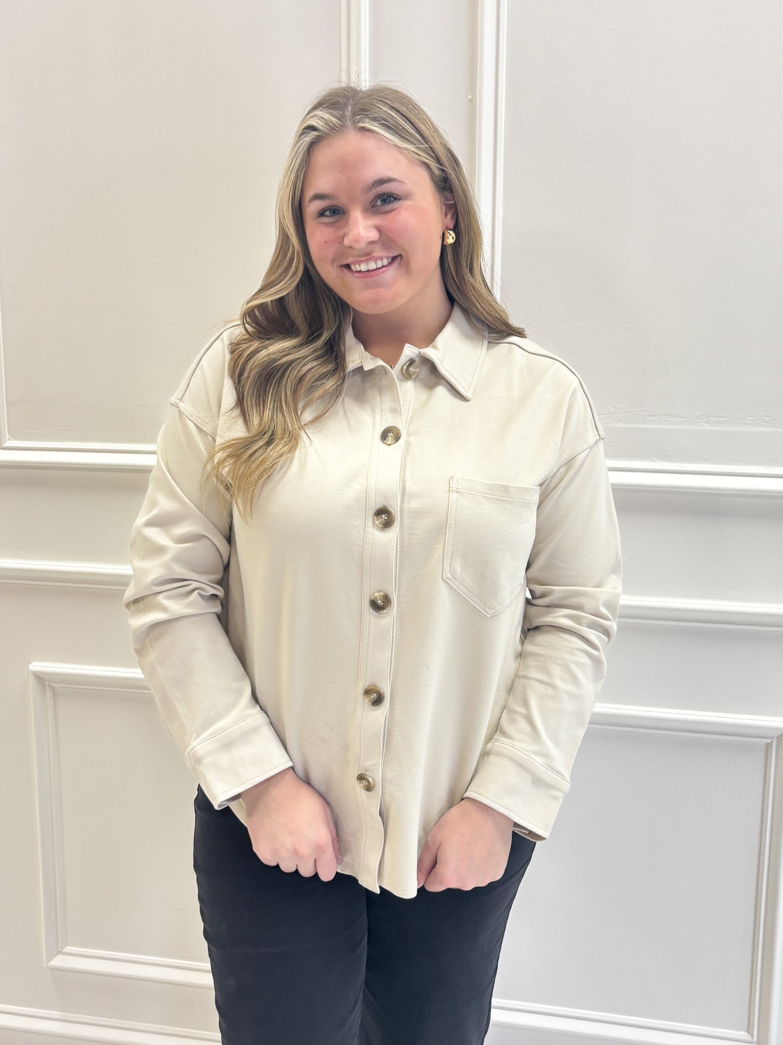Discover effortless layering with this versatile shacket that bridges the gap between casual comfort and polished style. Crafted from a premium blend of rayon, nylon, and spandex, it offers a luxurious feel with just the right amount of stretch. The classic button-down design features a spread collar, long sleeves, and a single chest pocket for practical everyday wear. The unlined construction keeps it lightweight and breathable, while the flattering U-hem adds modern dimension. Perfect for transitional seasons or year-round styling, this solid shacket is your go-to piece for looking put-together without sacrificing comfort.