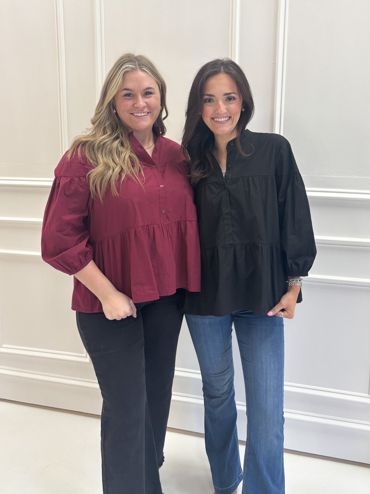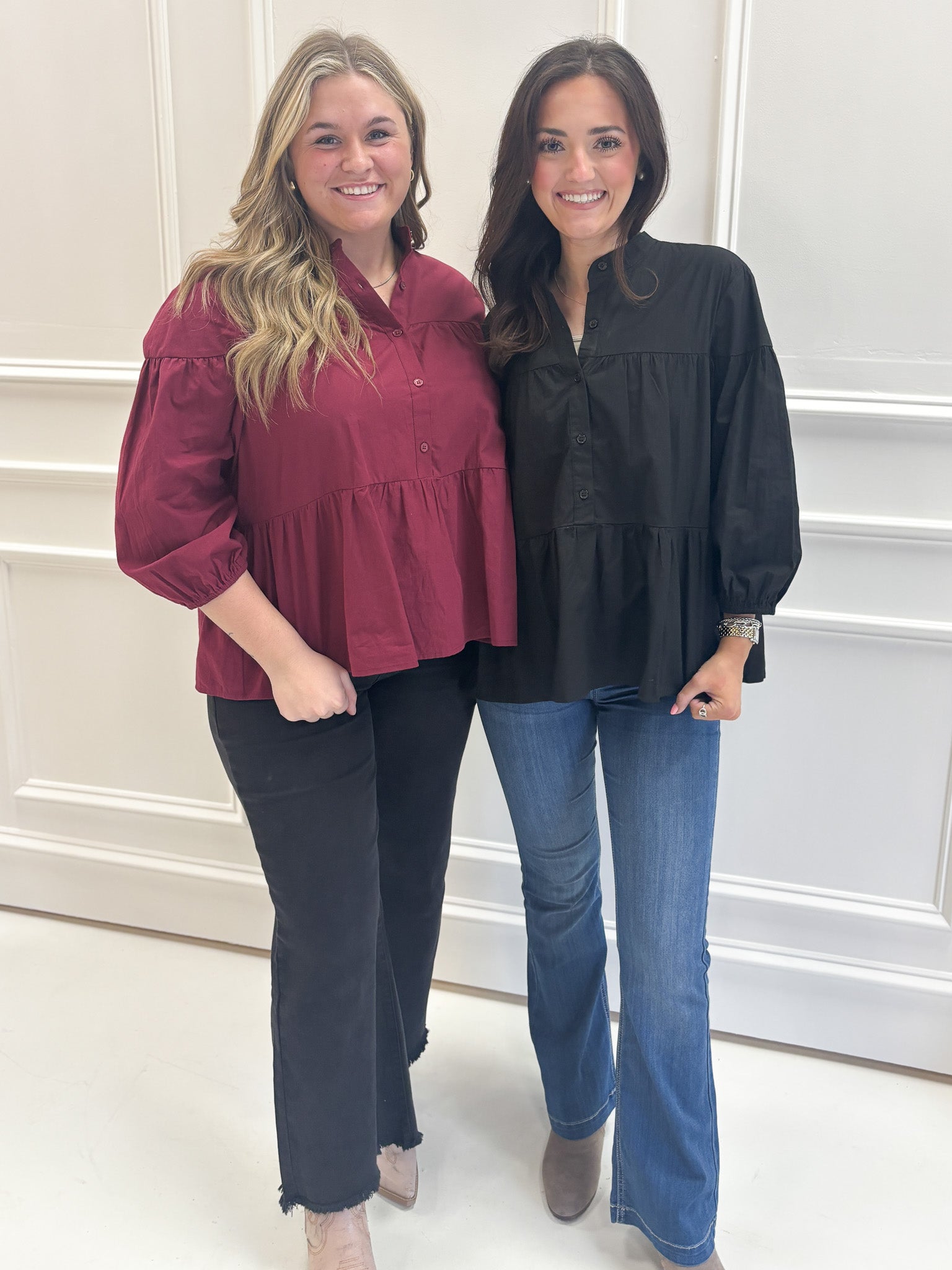 Elevate your everyday wardrobe with this versatile tiered blouse. The rounded neckline and partial button-front design offer effortless style, while the three-quarter sleeves with elastic cuffs provide a polished, put-together look. Layered tiers add dimension and movement, making this solid top perfect for dressing up or down. A timeless piece that transitions seamlessly from office to weekend.