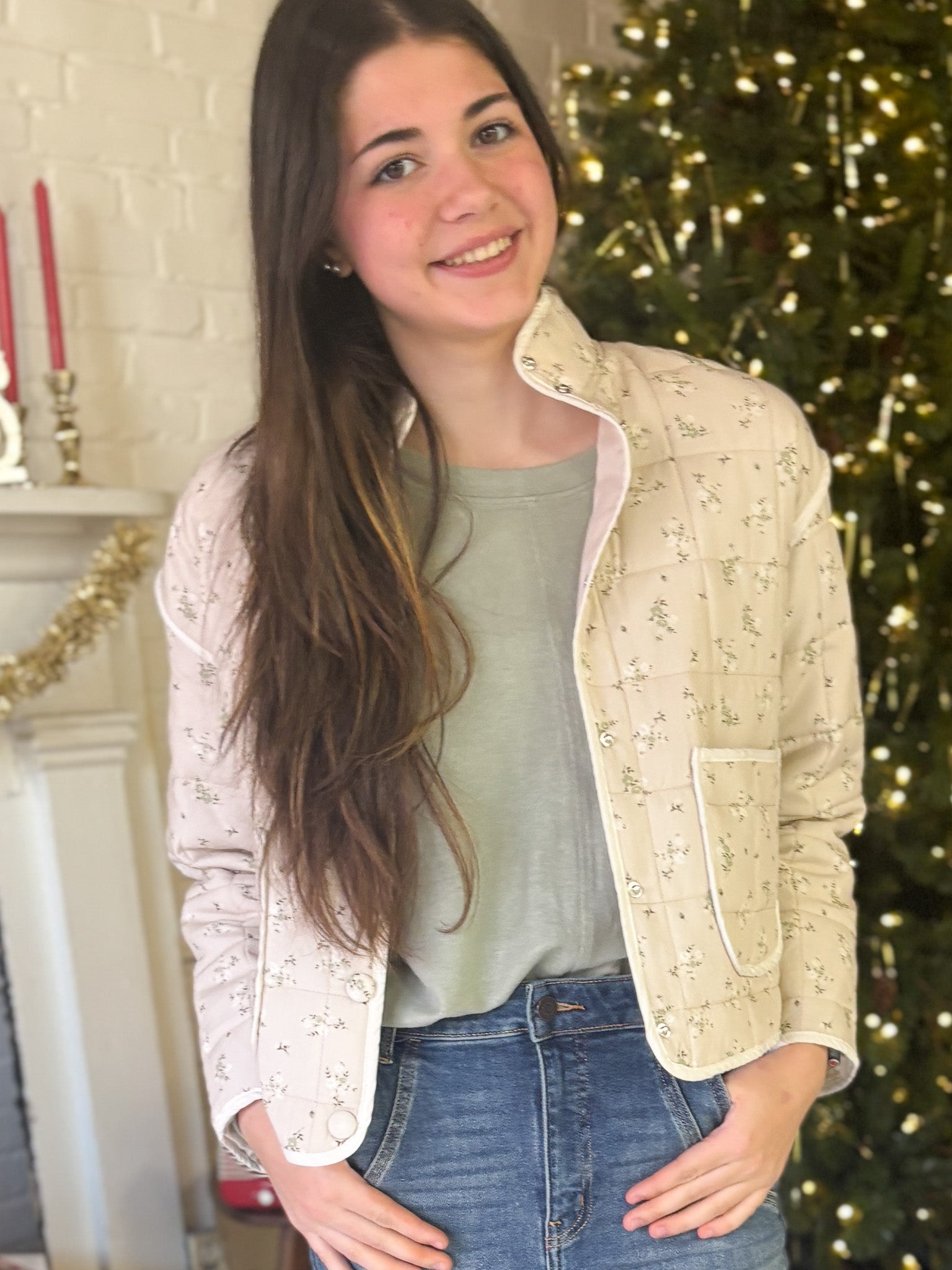 Stay warm and stylish this season with our Winter Blossom Quilted Jacket. This sophisticated puffer features a charming quilted floral pattern that elevates any winter wardrobe. The mock neckline and snap button pockets offer practical functionality, while decorative button details and trim accents add refined polish. Crafted from luxurious rayon shell and lining with polyester fiber filling, this jacket delivers both comfort and durability for those chilly days ahead.